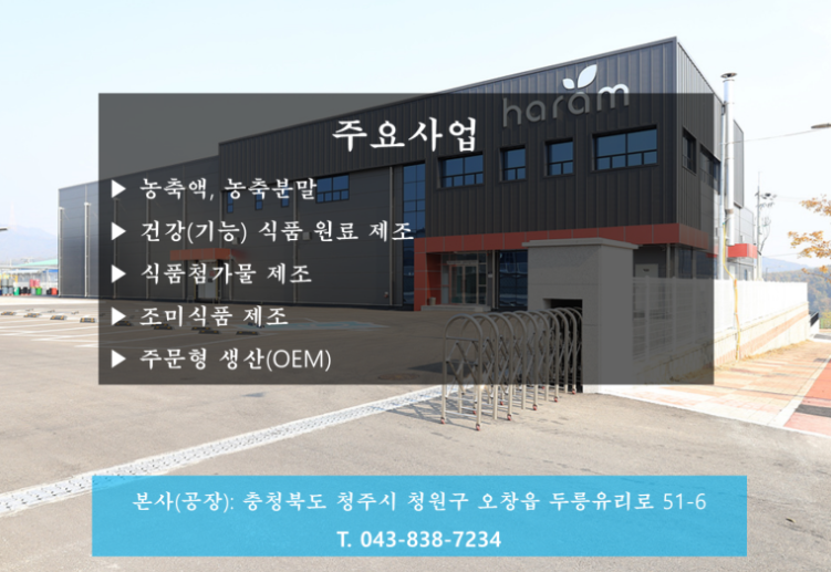 저희는 원료 제조를 전문으로 하고 있으며, 건강기능식품, 수퍼푸드 원료, 식품첨가물, 액상차, 소스, 드레싱, 시즈닝 등을 생산하고 있습니다.